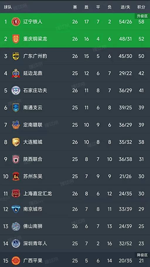 昨天的中甲联赛进行了第26轮,共有4场比赛结束,让我们一起来看看最新的积分榜情况吧!
